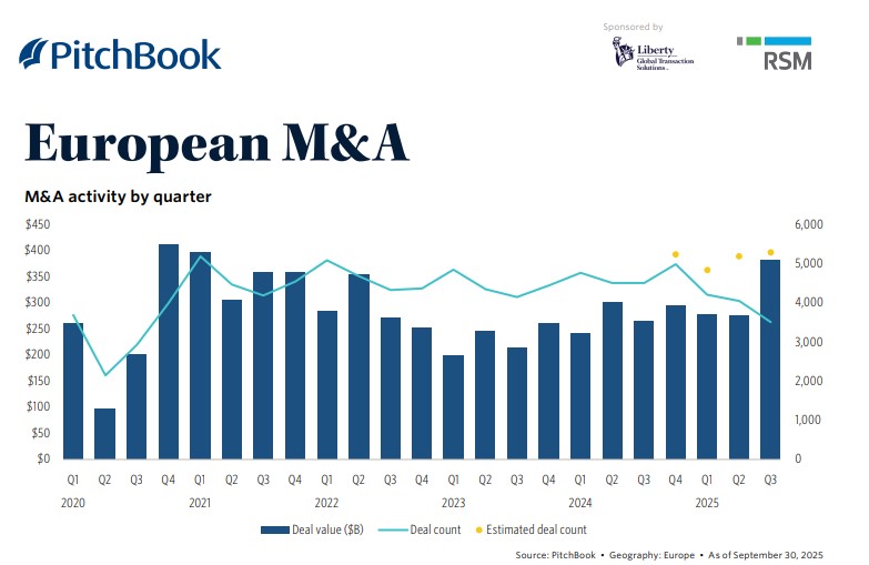 De fusies en overnames in Europa namen het afgelopen kwartaal een hoge vlucht. De dealwaarde in het derde kwartaal bereikte het hoogste niveau sinds het eerste kwartaal van 2021. De totale waarde van fusies en overnames steeg met 37,8%, terwijl het aantal deals een kwartaalrecord bereikte in vijf jaar tijd, doordat beleggers de zorgen over de tarieven die de activiteit in het tweede kwartaal hadden gedrukt, naast zich neerlegden.